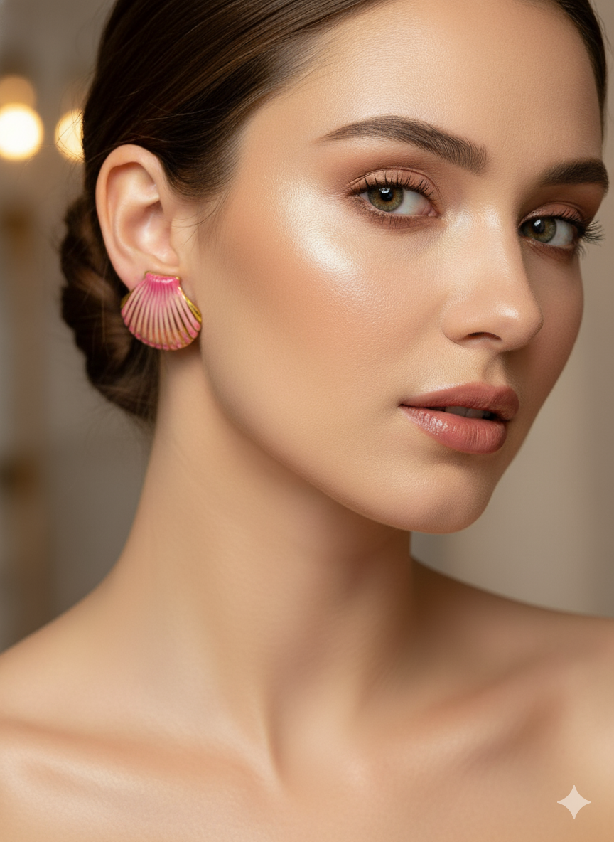 Elegant, stainless steel stud earrings in a timeless clam shell shape. The glossy enamel is detailed with beautiful, radiating gold lines, offering a sophisticated nautical touch.