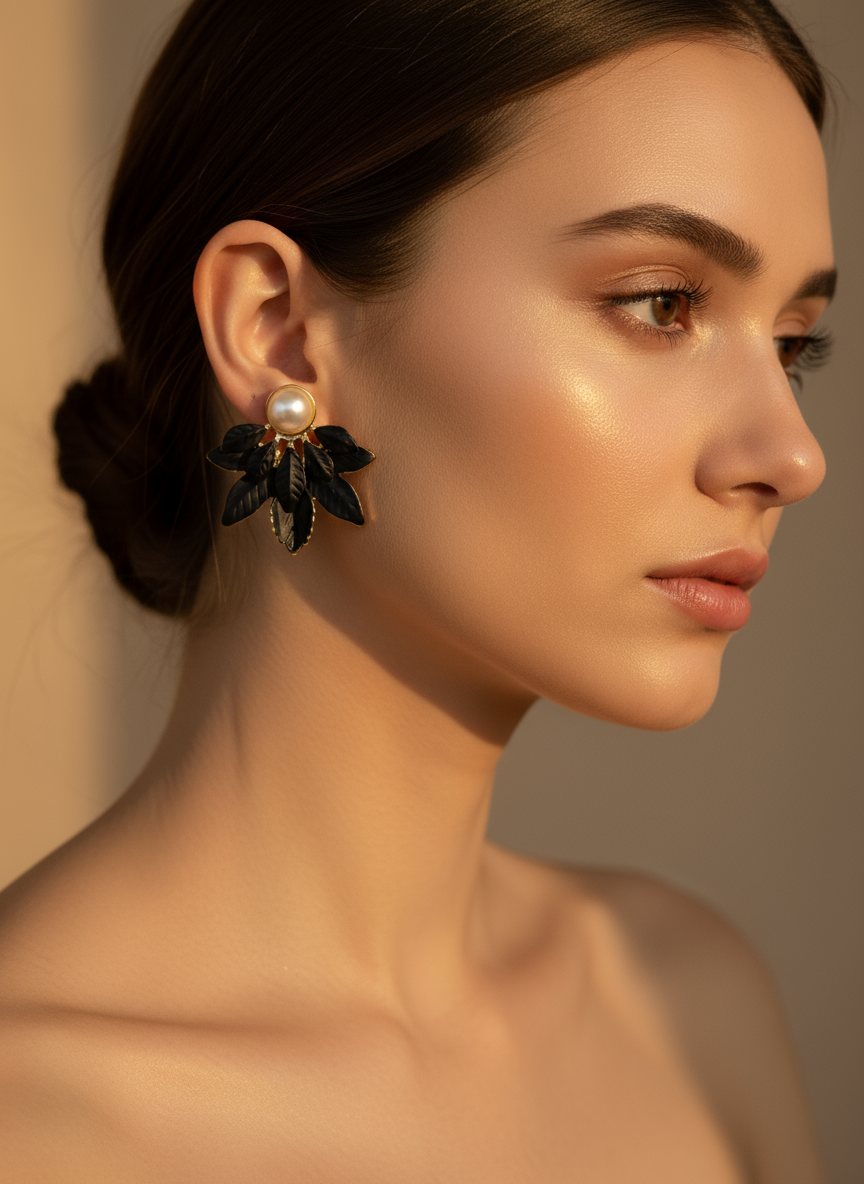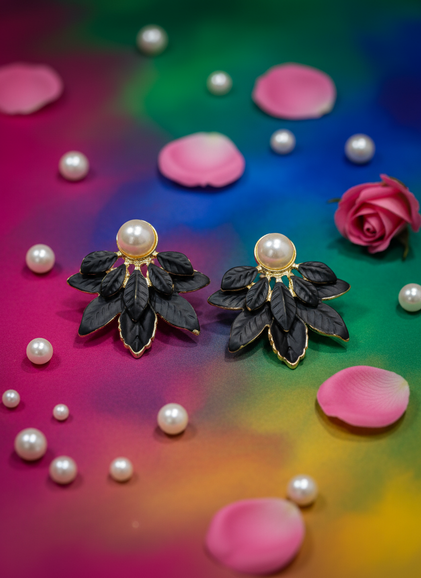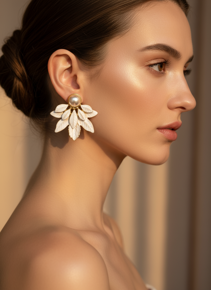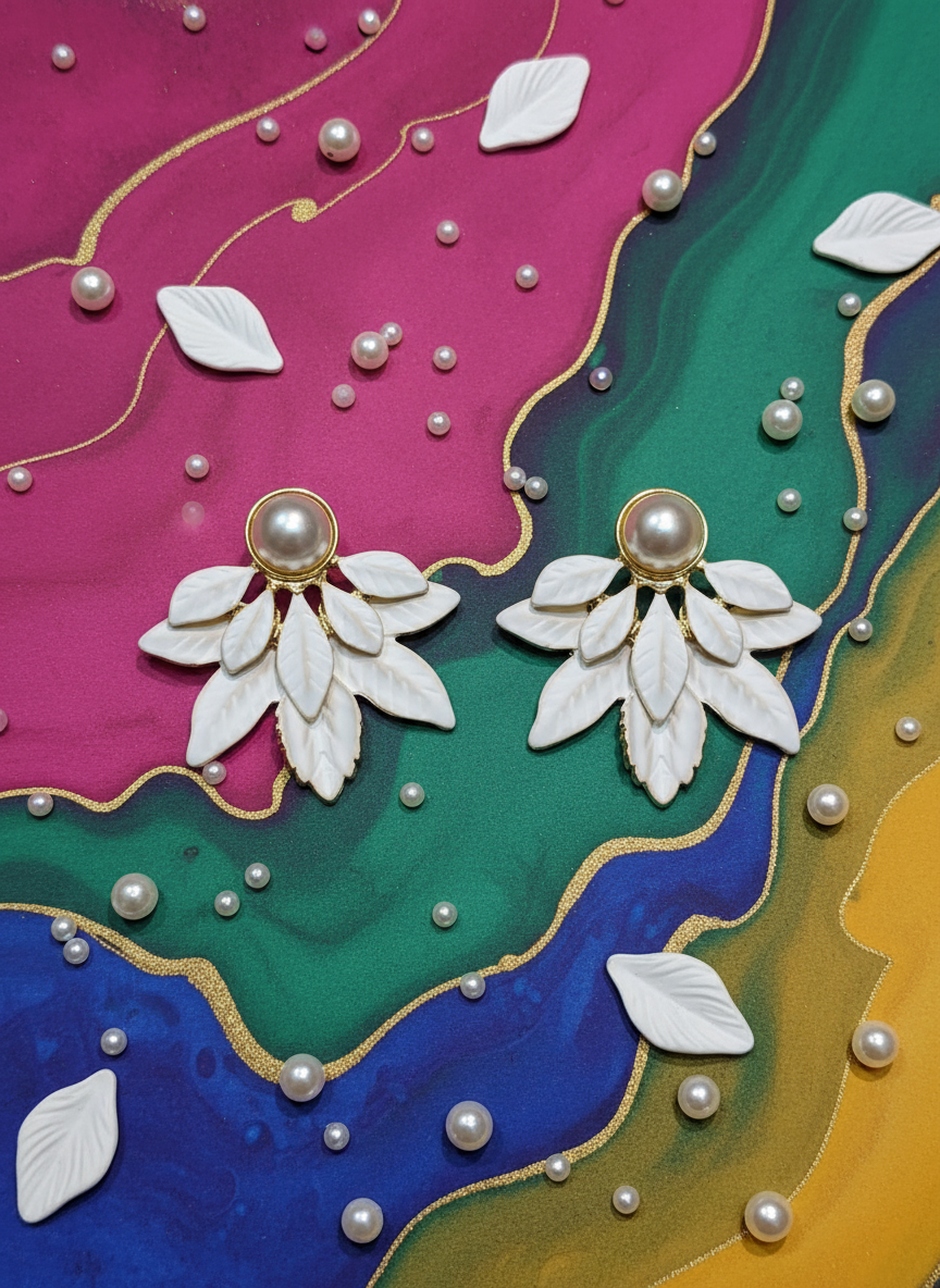 "Capture the serene beauty of a frosty morning with our Frosted Leaf Clusters. These striking statement earrings are anchored by a glowing, creamy mother-of-pearl stud, from which sculpted enamel leaves fan out in a natural, tiered design. The subtle contrast between the matte leaves and the polished gold-tone metal makes this pair feel luxurious and unique—a truly elegant piece inspired by nature."
