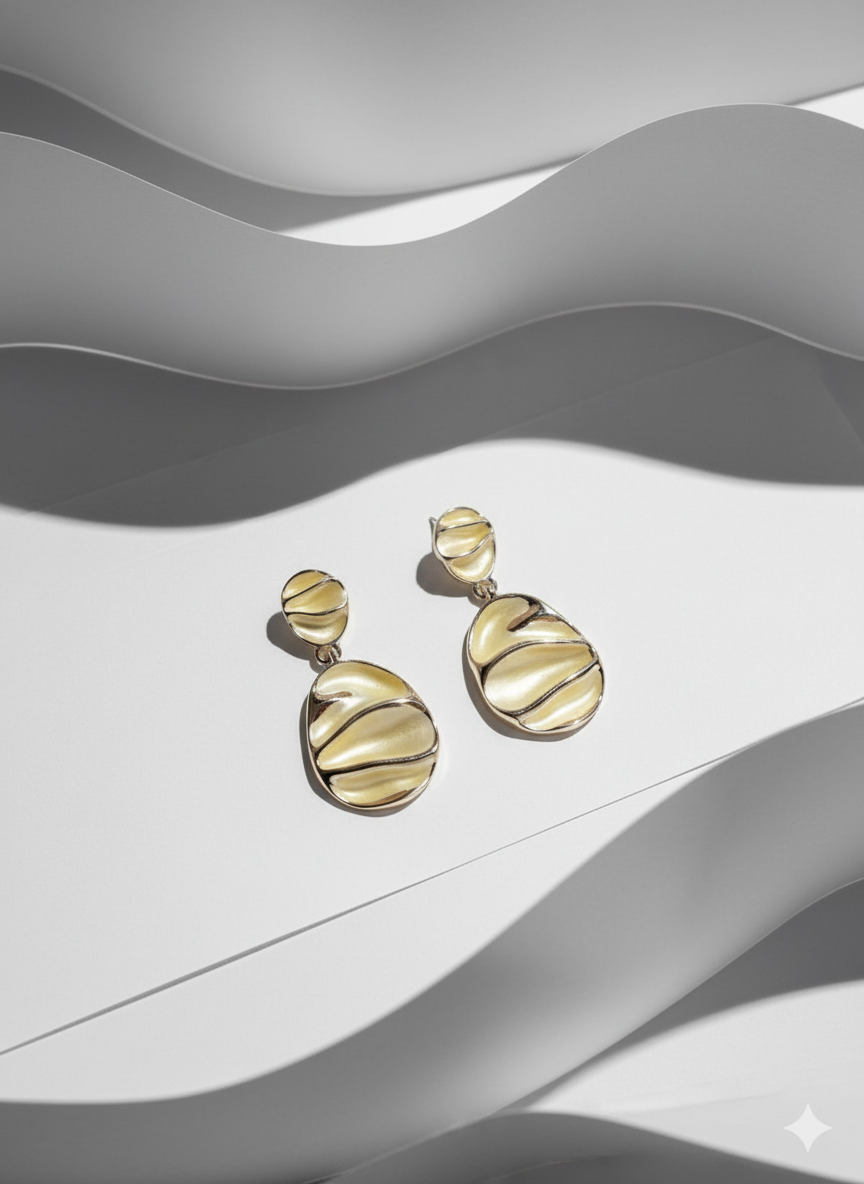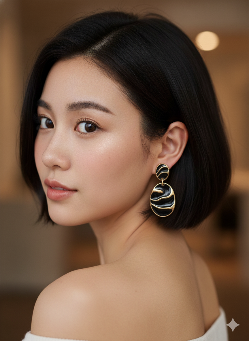 contemporary drop earrings featuring two irregular, high-polish black & white enamel stones outlined in silver-tone metal. The abstract, flowing lines create a striking, artistic design.