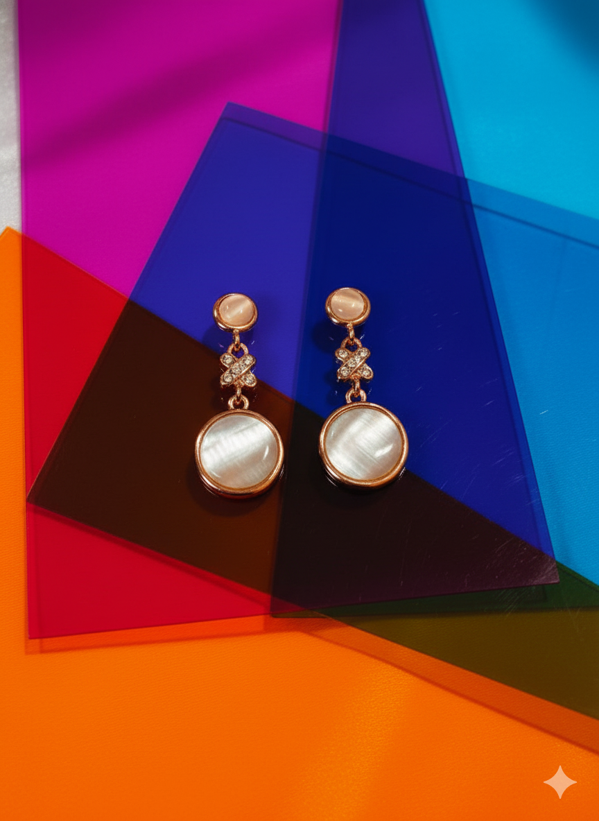 Capture the ethereal glow of moonlight. These exquisite earrings showcase large, polished circular gems with a beautiful, milky luminescence—often called the "cat's eye" effect. They are linked to a smaller, round stud and a crystal-encrusted floral connector, all set in a lustrous rose gold-tone metal. The gentle movement and subtle sparkle make these drops an enchanting addition to any jewelry collection.